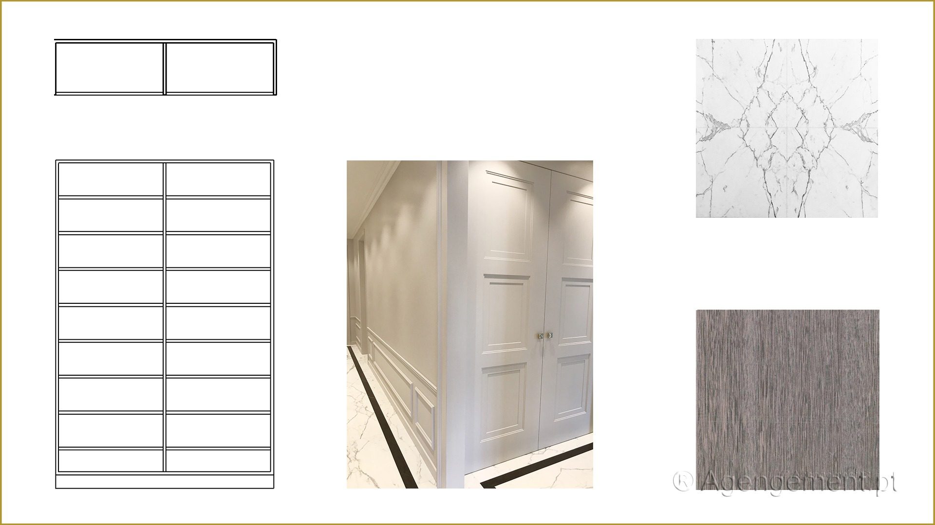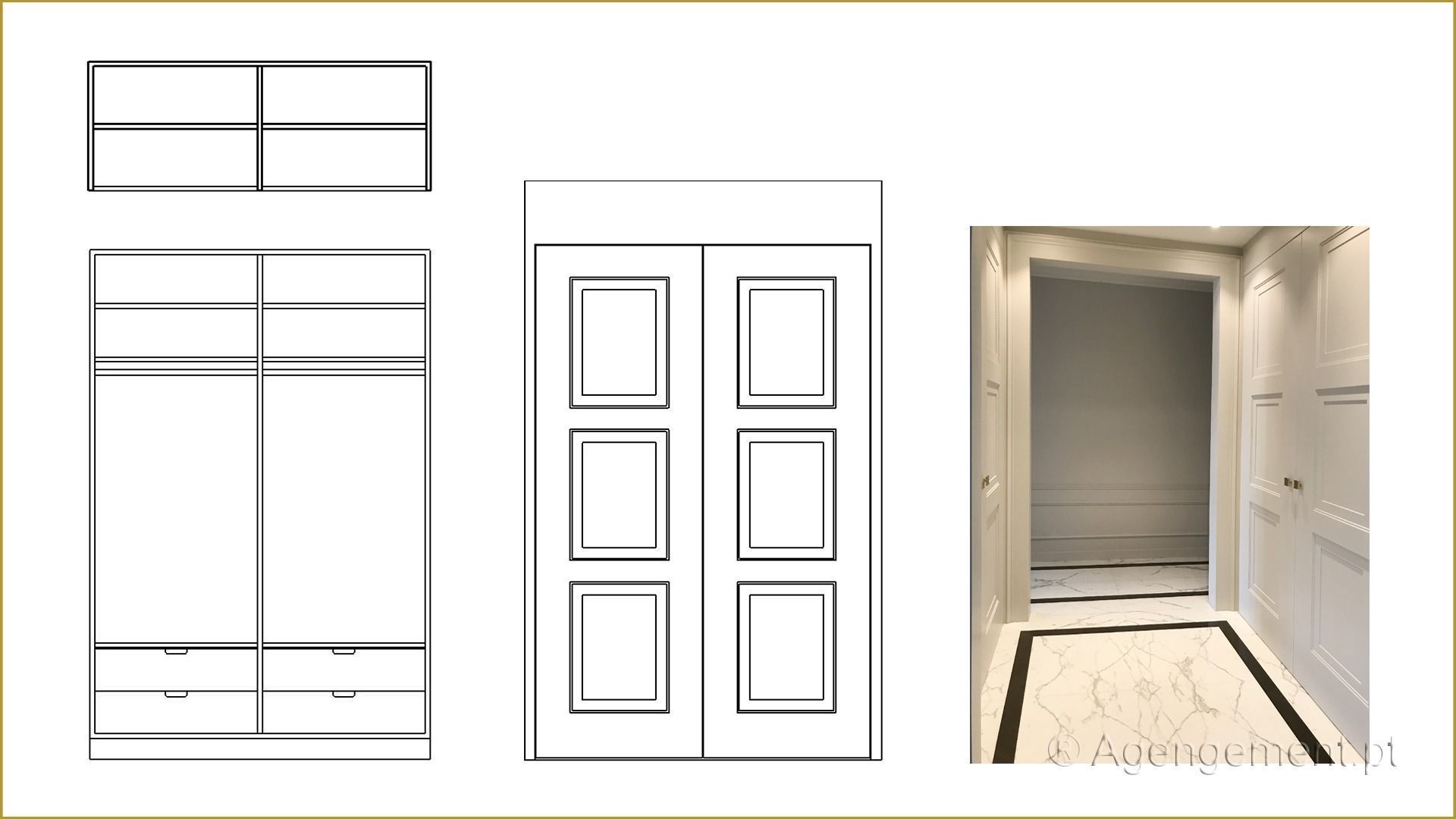 Ce Dressing d’Entrée sur mesure révèle les savoir-faire traditionnels et l’esprit contemporain de nos réalisations. Les portes personnalisées de ce dressing, mêlent classicisme et modernité dans une combinaison subtile et harmonieuse des lignes. Reprises dans tout l’appartement, comme faisant partie de la singularité de cet environnement parisien aux accents Haussmanniens et de la personnalité de son commanditaire. C’était sans compter sur le jeu intérieur des étagères habillées d’un placage de bois de Lati déployant leur couleur grise, comme un écho aux marbrures du sol.